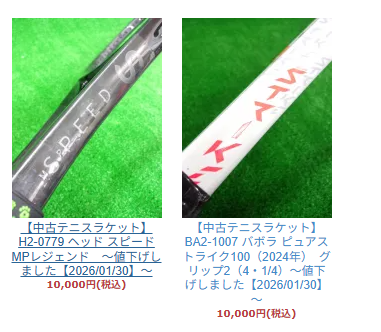HOME > お知らせ > お知らせ 中古テニスラケット関連中古ラケット値下げ情報 2026年1月30日 以下ラケット値下げとなります。 よろしくい願いいたします。 Post Share Pocket Hatena LINE URLコピー -お知らせ, 中古テニスラケット関連